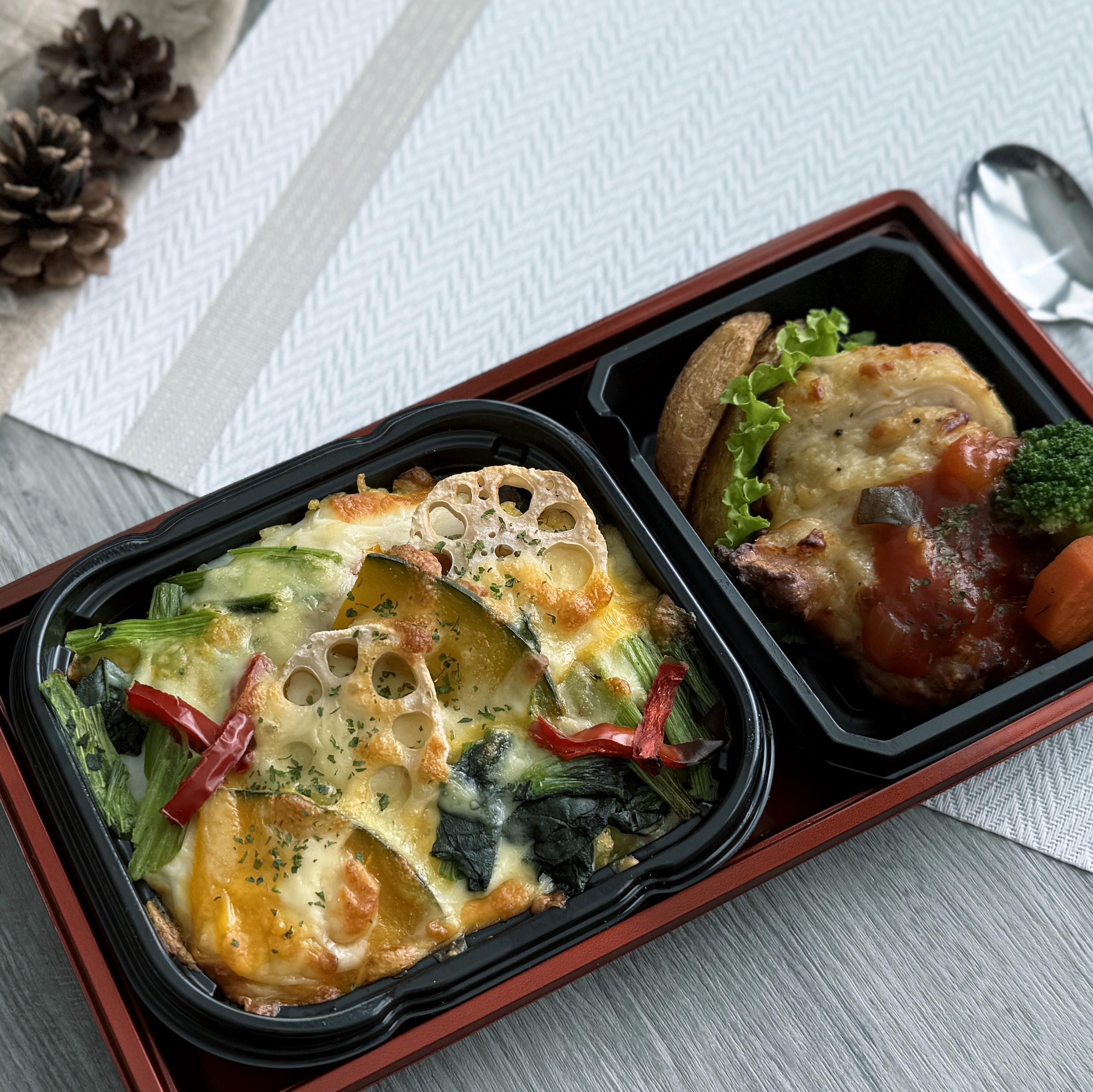 &鶏もも肉のアスパラチーズ巻御膳Winter vegetable & four-cheese meat sauce doria with asparagus and cheese wrapped in chicken leg gozen